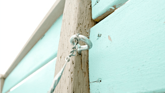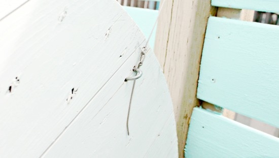 To place the stencils at the correct angle, hang the painted spool to the fence or wall first. The spools are very heavy so make sure you attach them securely. For this spool, we used fenced staples for the back of the sign and large screw eyes on the privacy wall supports. Stainless steel wire was used to suspend the sign.